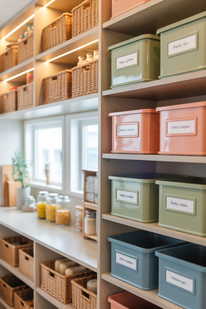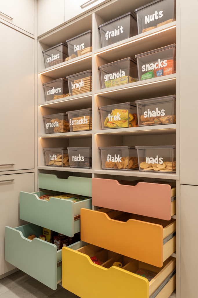 A dedicated snack zone keeps kids-and adults-happy and organized. Use stackable baskets and pull out drawers to separate treats, cereals, and lunch items. Even a small space pantry can feel large when zones are defined. Color-coded bins from Kmart or Ikea make grabbing snacks fast and fun.