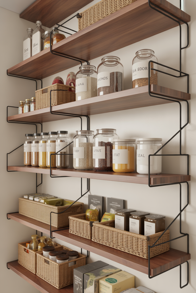 The trend toward open shelving is back, but this time it’s smarter. Mix wood and wire shelf materials, keeping everyday food staples accessible while adding decorative touches. Clear jars, woven baskets, and small bowls keep items visible yet stylish. It’s functional beauty inspired by modern design blogs like The Organized Home.