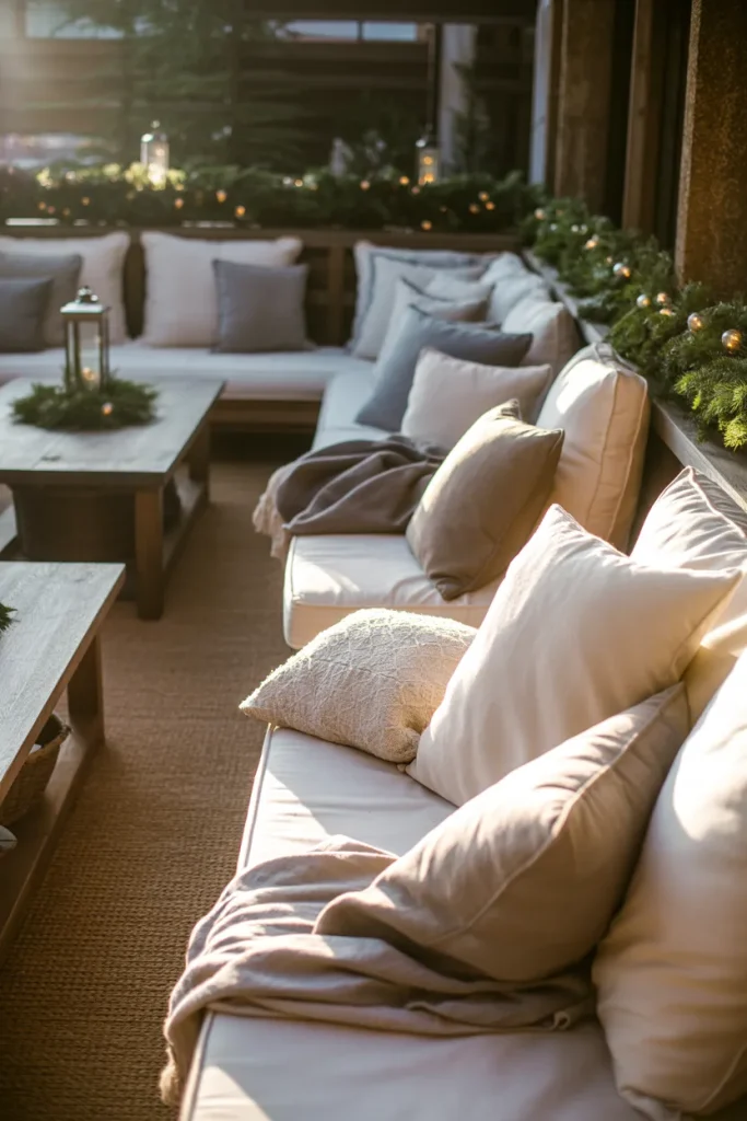 Cozy patios look good and exude warmth at Christmas. With comfy furniture, soft lighting, and a few seasonal touches, the greenery and lighting can be inviting, even in the winter. It’s not about heavy decorations.