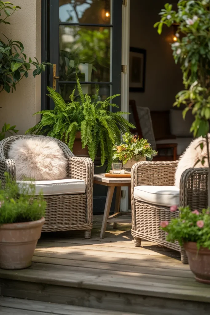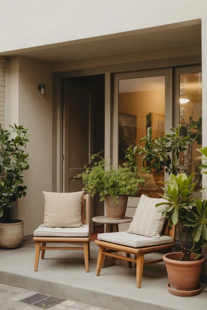 A thoughtfully styled front patio creates a warm first impression without feeling formal. With cozy seating and simple accents, it becomes a place to pause rather than pass through. This idea works well for homeowners who value connection with their surroundings.