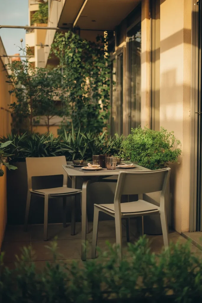 A condo patio does not have to be large to feel spacious. For example, a small space layout designed for two is optimized for casual dinners or quiet conversations. Here, thoughtful proportions weigh in more than the overall square footage.