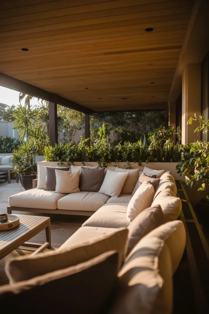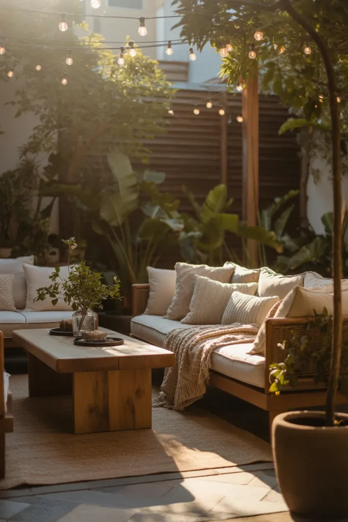 This style fits perfectly with the American habit of unwinding outdoors after dinner, especially in suburban areas. A fire bowl or lanterns extend usability into cooler nights, while weather-friendly fabrics keep maintenance easy. It’s less about formality and more about creating a place people naturally gather.