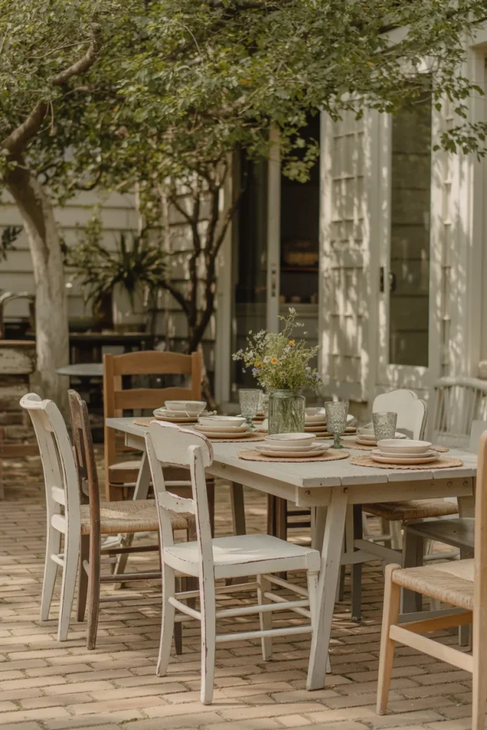 The relaxed simplicity of a farmhouse patio is very pleasant, especially when combined with a backyard setting. A sturdy table with some mixed seating is an inviting casual dining arrangement. The style is plain, down-to-earth, and practical for everyday use, rather than a setting reserved for entertaining guests.