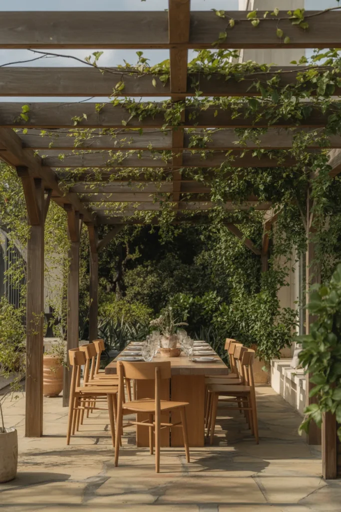 A covered patio with a pergola provides a feature without completely closing off the outdoor space. On larger patios, this combination creates a distinct dining area while still offering light and ventilation. It feels thoughtful and design-driven, making outdoor dining a regular rather than occasional experience.