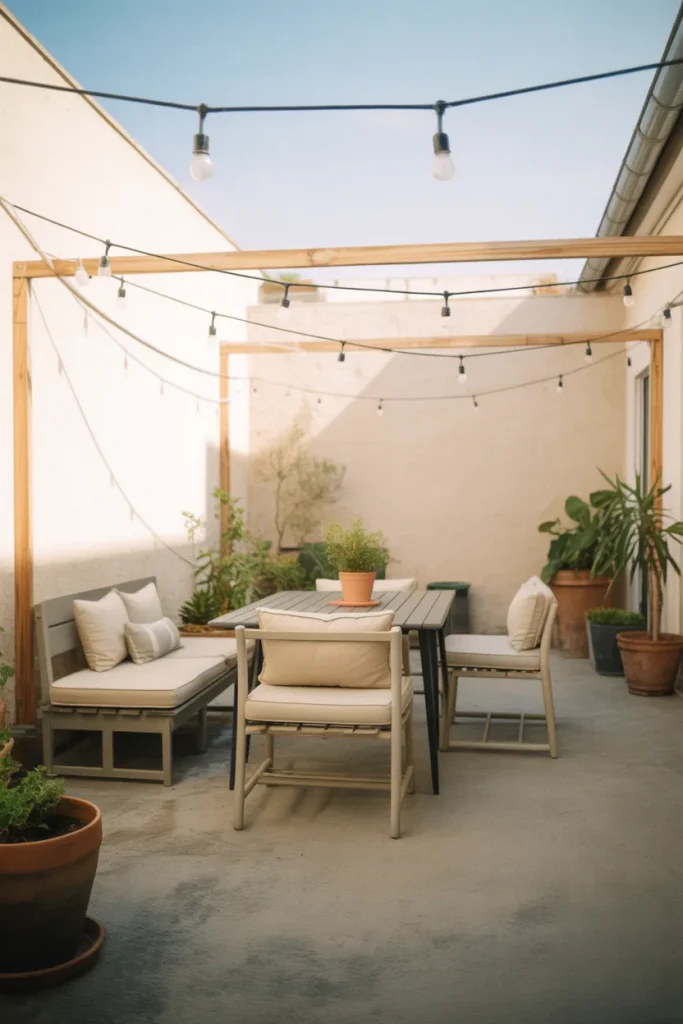 A concrete patio doesn’t have to feel cold and industrial. With the right approach, it can be surprisingly cozy, particularly in a backyard setting. Cushions, textiles, and warm lighting construction create a welcoming retreat that feels balanced rather than stark.