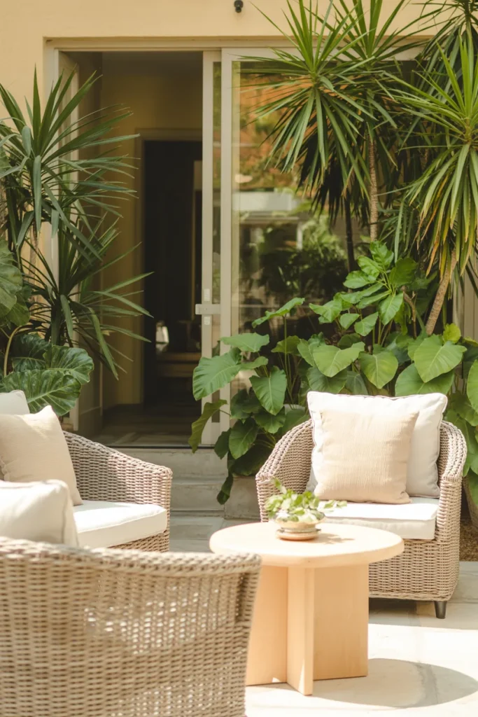 A common mistake is placing all plants at ground level. Varying height keeps the patio visually balanced and prevents the space from feeling cluttered or flat.