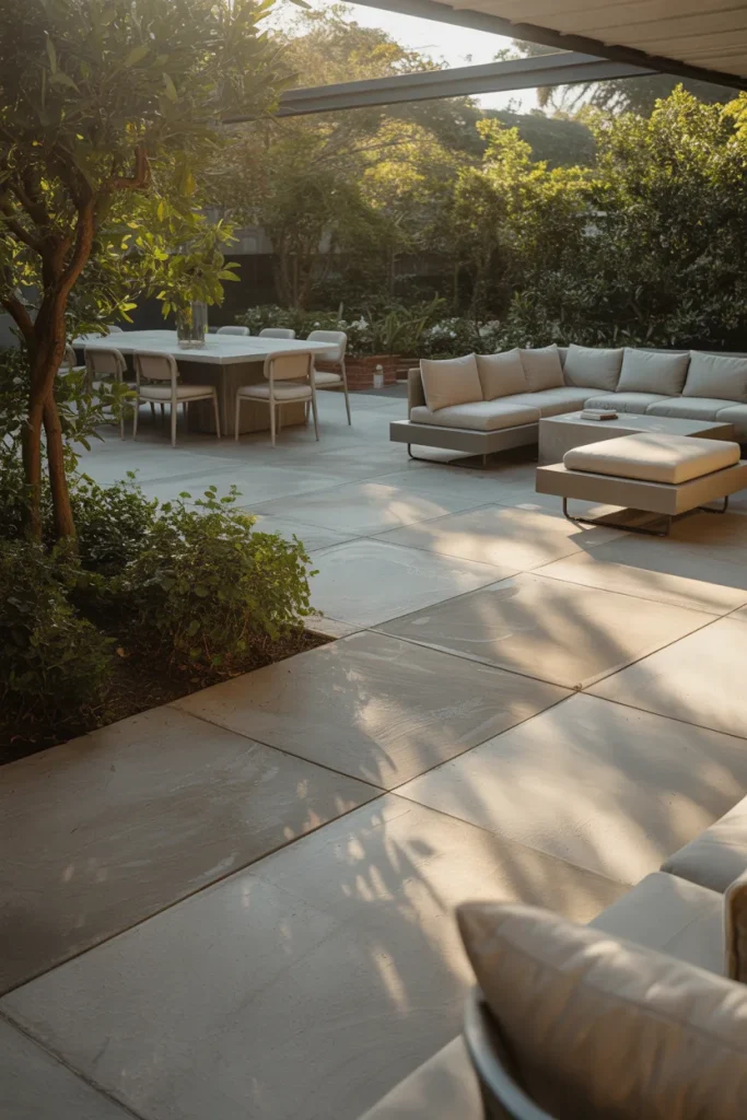 A large patio allows you to entertain, particularly with a backyard designed for socializing. Large, durable furnishings like concrete allow multiple zones without feeling cluttered. The key is balance; don’t fill every inch.