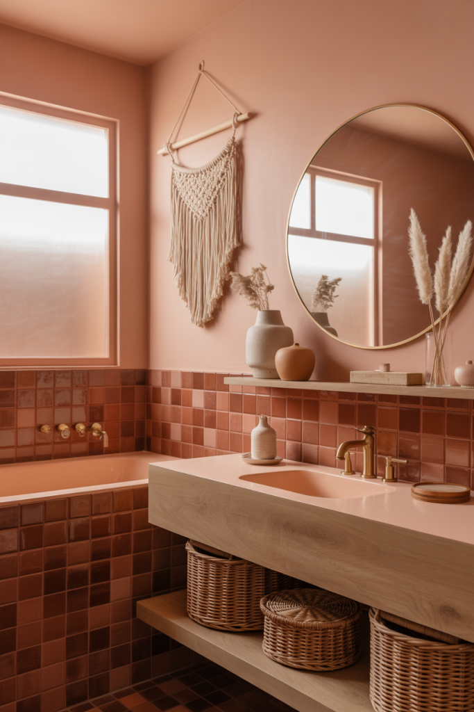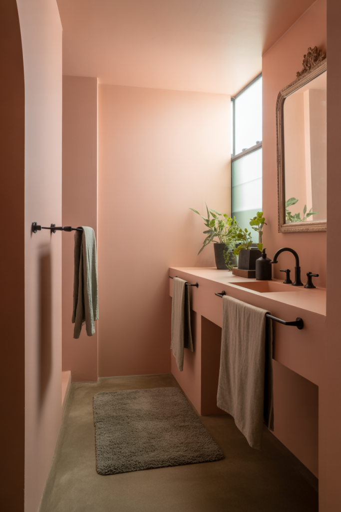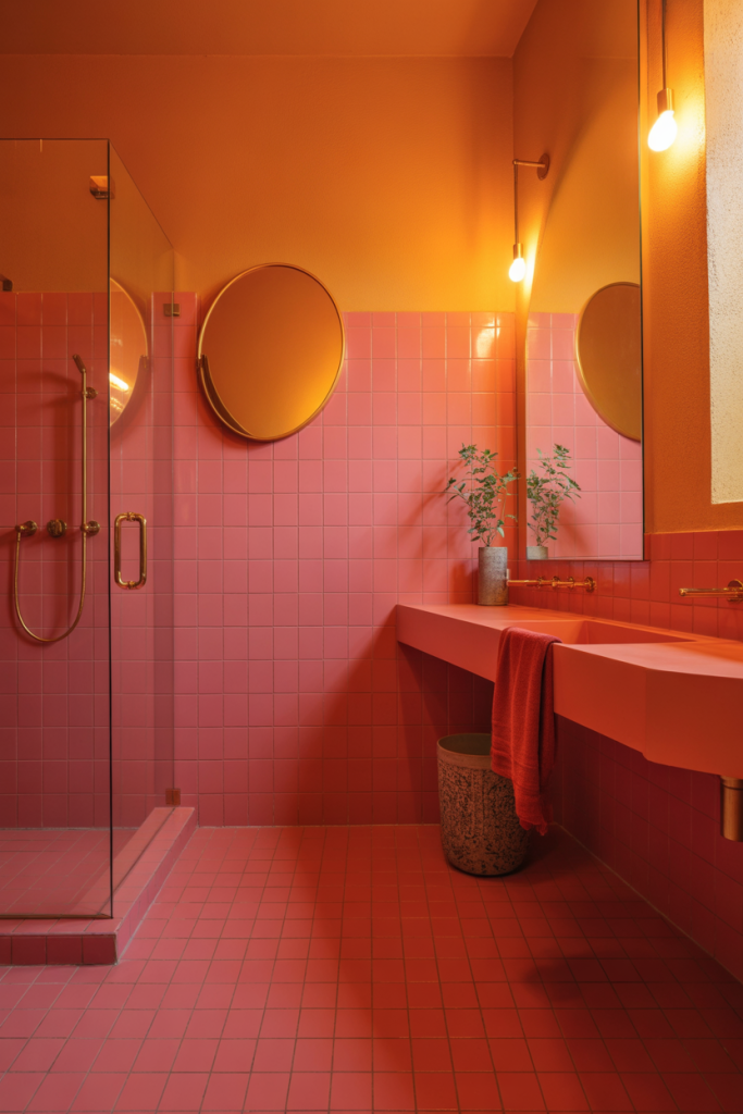 Combining blush pink with Orange and muted gold tones adds a sunset-like warmth. While it may sound bold, I’ve seen this palette in Southwestern-inspired homes, where it created a radiant atmosphere. It works especially well in bathrooms with lots of natural light, amplifying the cozy glow. This is for decorators who enjoy color-rich environments.