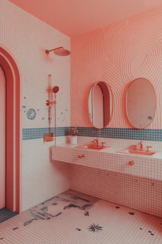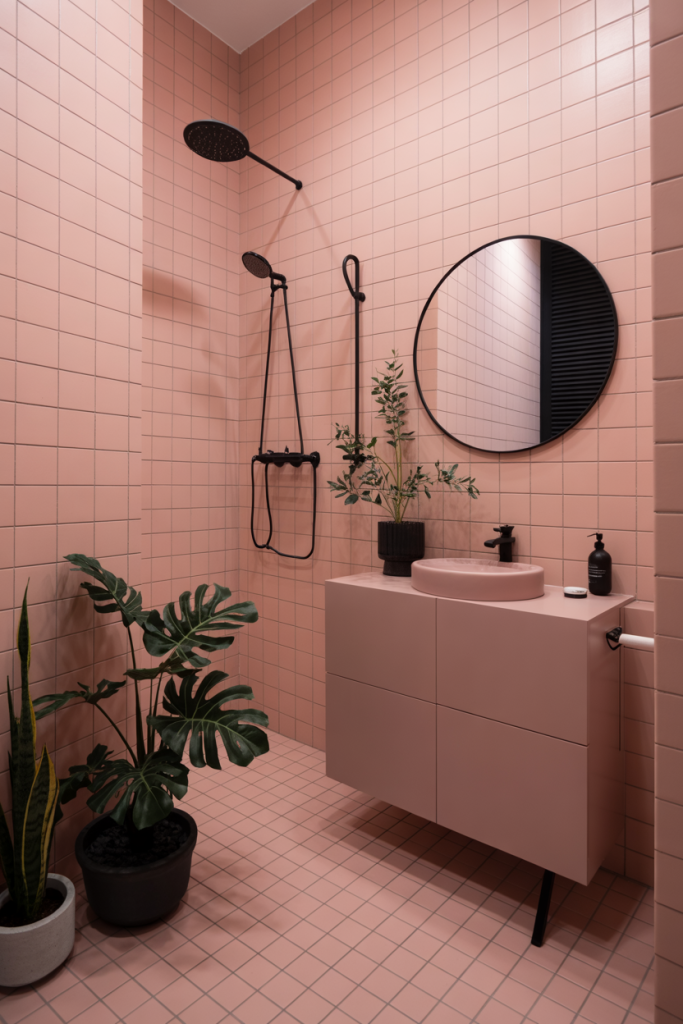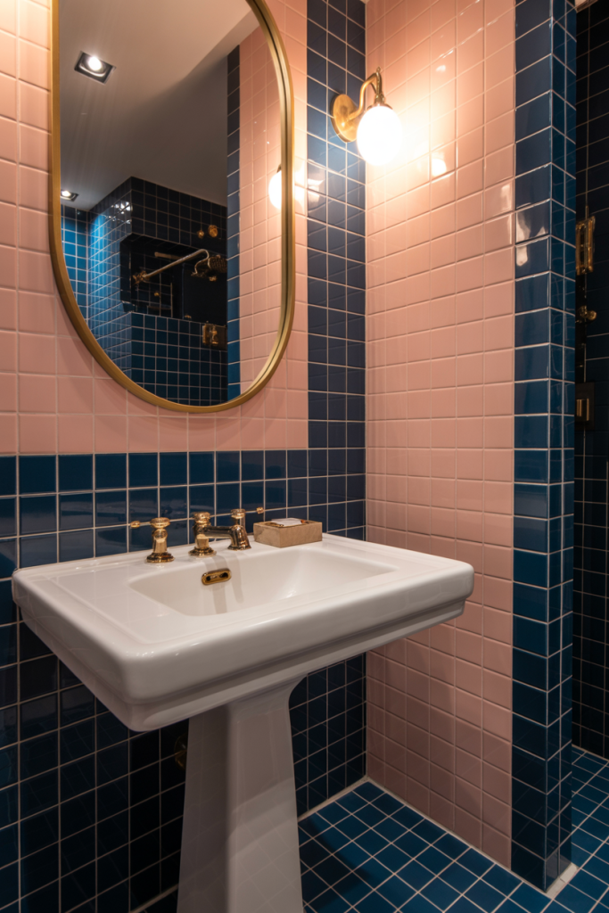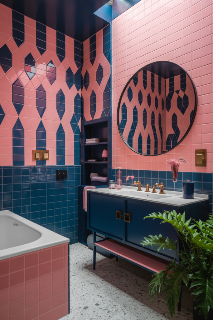 Mixing pink with Navy and geometric shapes can create a fun, punchy Retro atmosphere. I remember touring a city loft where the owner used navy star-pattern tiles against a blush wall—it felt like a boutique hotel. This palette is ideal for people who enjoy graphic design influences and want a bathroom that feels energizing and creative.