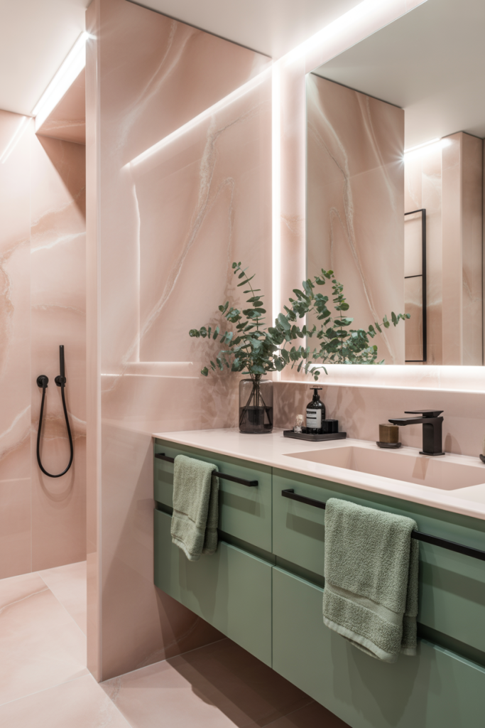 Soft pink marble instantly elevates a bathroom, especially when paired with subtle Sage green, Black and, or Grey and notes for balance. I once toured a new-build where the owners chose pink-veined marble for the vanity top, and it felt quietly luxurious without trying too hard. This idea works beautifully in upscale homes or condos aiming for long-lasting elegance and a gentle, spa-like mood.