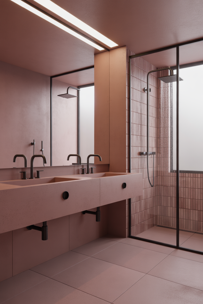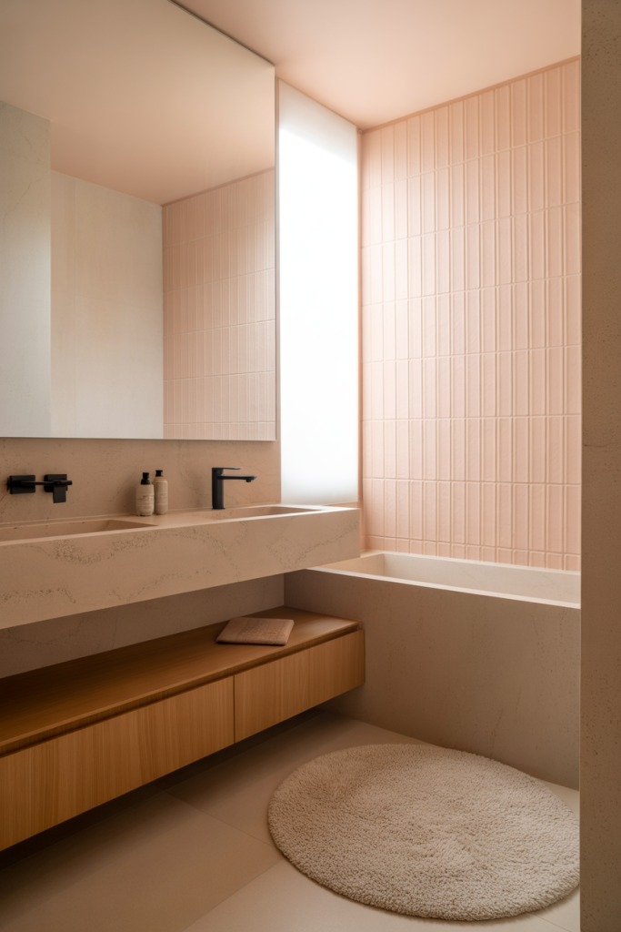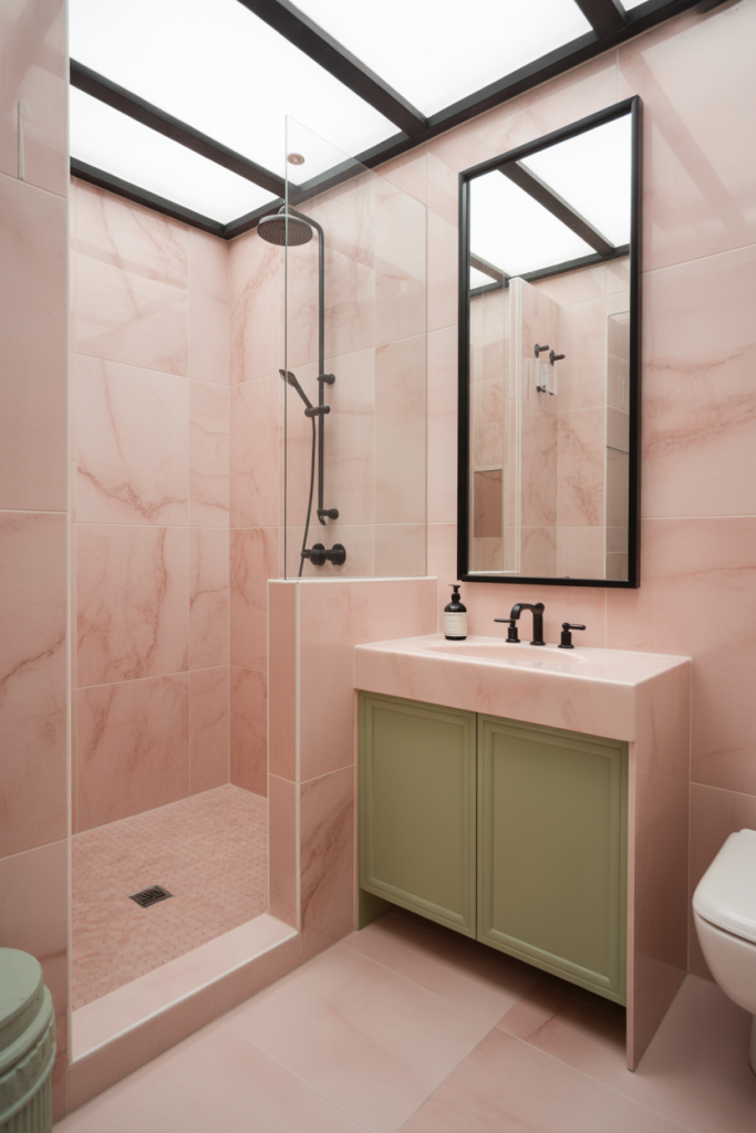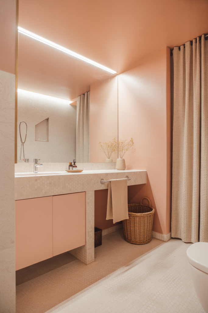 For those who prefer understated tones, blending pink with Beige and sandy neutrals creates the softest, most Modern warmth. A real-estate agent once told me that beige-pink bathrooms photograph beautifully because the colors flatter all skin tones. This pairing thrives in small bathrooms where you want light diffusion and a welcoming, spa-like feel.