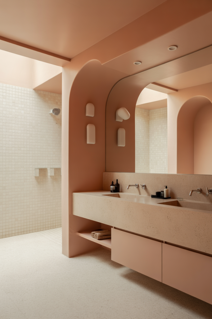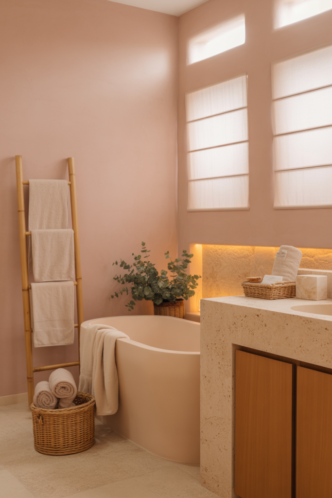 A blush spa room blends Blush, Soft, and Beige and textures to recreate a wellness-club atmosphere inside your home. A neighbor told me their pink spa-style bathroom became a favorite unwinding spot after work—warm towels, calm lighting, and gentle colors do wonders. This works best in primary bathrooms where relaxation and daily rituals are the priority.