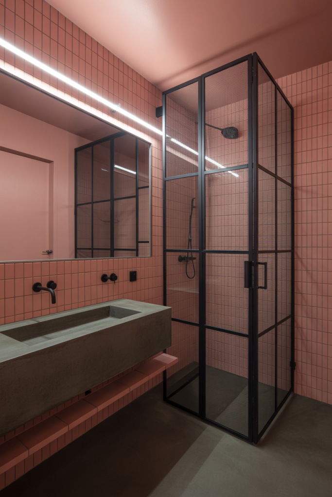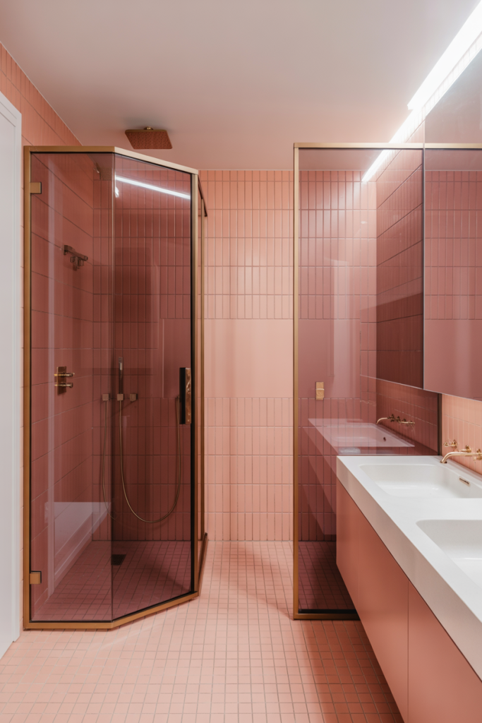 Pink-tinted glass shower doors or partitions create a subtle yet striking effect, especially when balanced with Gold and, Grey and, or Modern fixtures. I once toured a townhouse where the pink glass transformed an ordinary shower into a sculptural centerpiece—light passed through it with a warm, flattering glow. This idea works beautifully in spaces where you want color without overwhelming the layout.