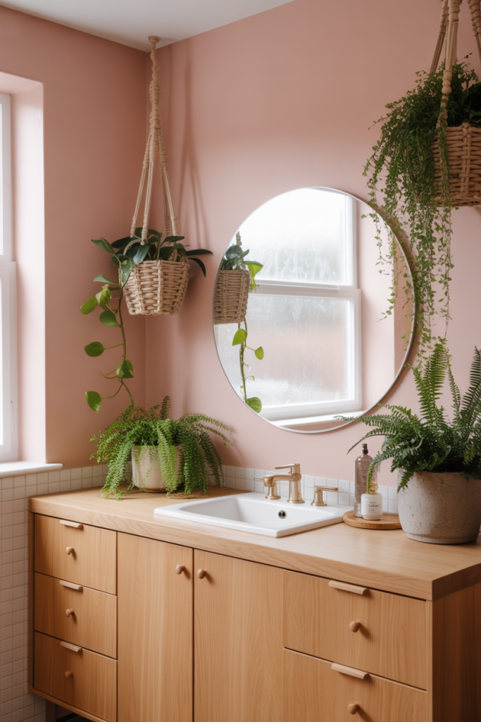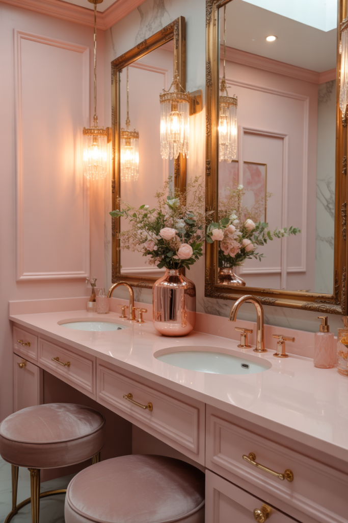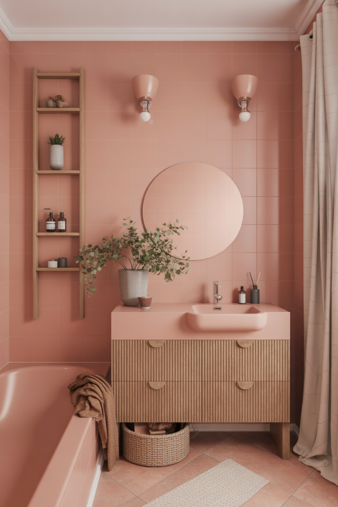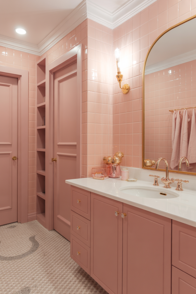 If you love playful interiors, styling pink with Decor girly charm and Gold and hardware can be delightfully glamorous. Think scalloped edges, rounded mirrors, and soft lighting. A blogger I follow said gold warms up pink like “sunshine on rose petals,” and she’s right—the combo feels uplifting. Perfect for anyone wanting a feminine yet polished bathroom.