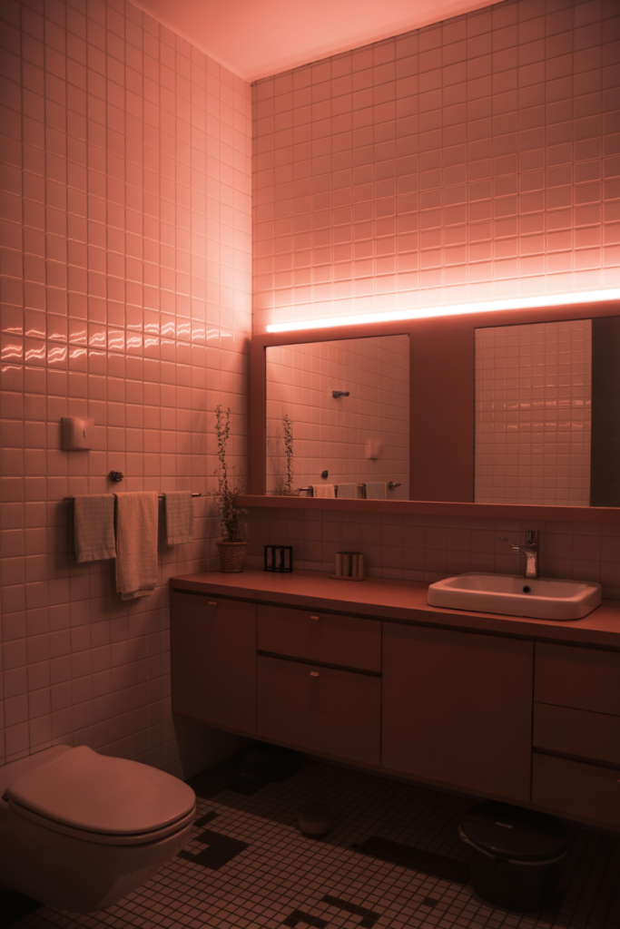 Instead of repainting, warm LED hues can tint a bathroom in soft pink tones, especially when paired with Cute, Aesthetic, or Retro décor. A young couple told me they installed color-tunable lights, and evenings instantly felt romantic and cinematic. This is perfect for renters or anyone wanting a mood shift without a major renovation.