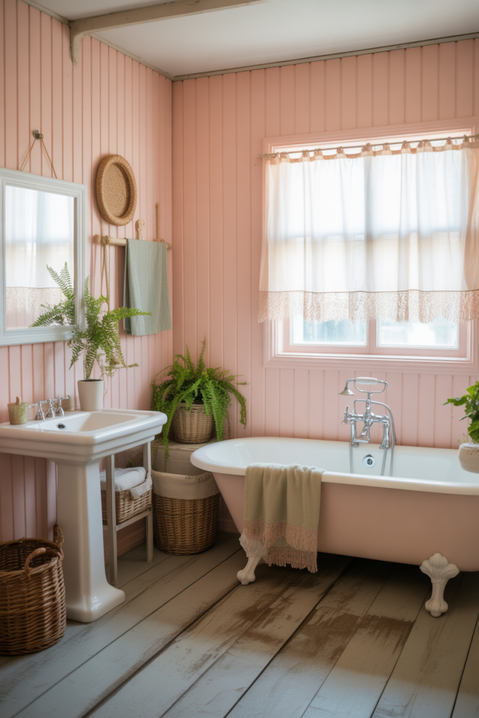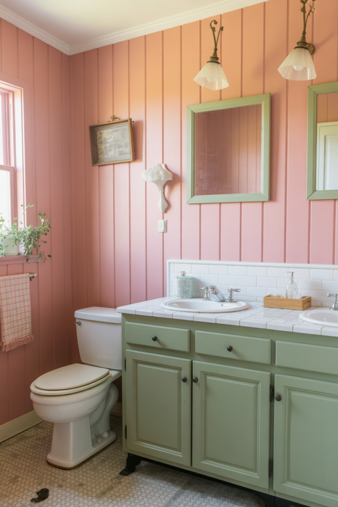 Wood paneling painted in rosy tones, paired with White and, Beige and, or Green and, brings a sweet cottage feel to a modern home. I visited a farmhouse renovation where the pink paneling looked timeless—almost storybook-like. This idea shines in country houses, guest bathrooms, or spaces you want to feel cozy and nostalgic.