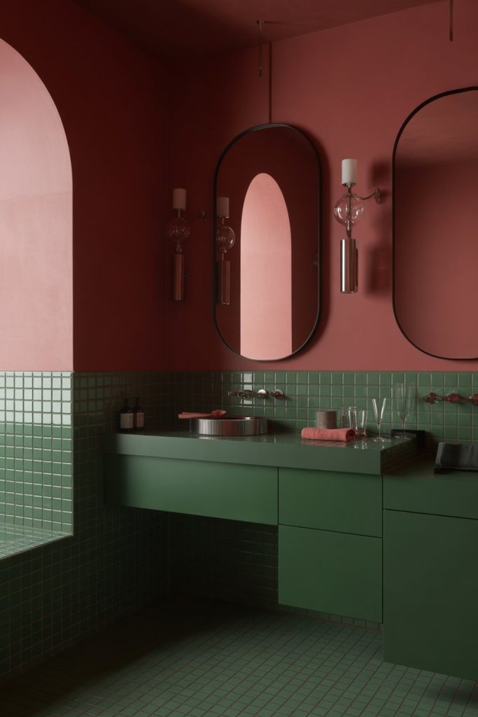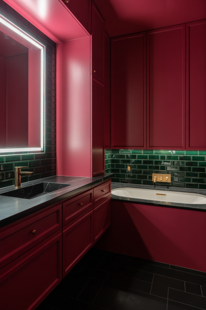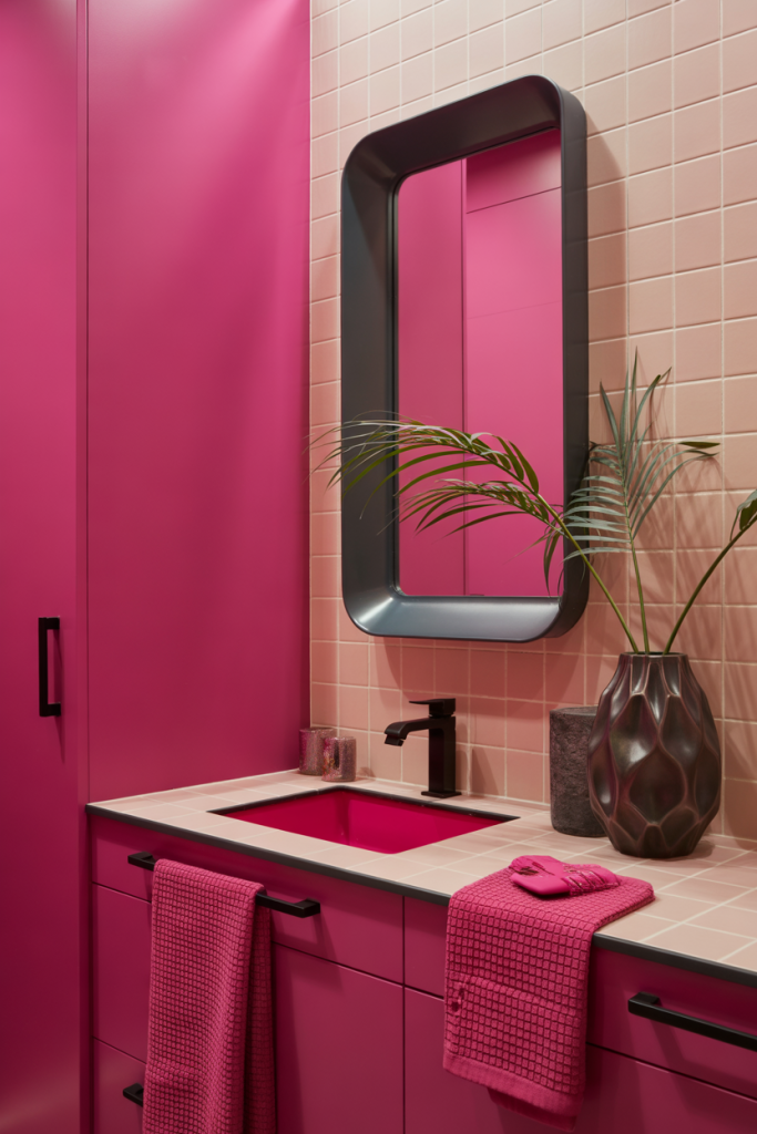 Deep raspberry pink pairs beautifully with Dark, Black and, and Dark green elements for a moody, luxurious feel. A boutique hotel I toured used this palette, and the effect was immersive and dramatic without overwhelming the eye. Perfect for large bathrooms or powder rooms where bold design makes a strong impression.