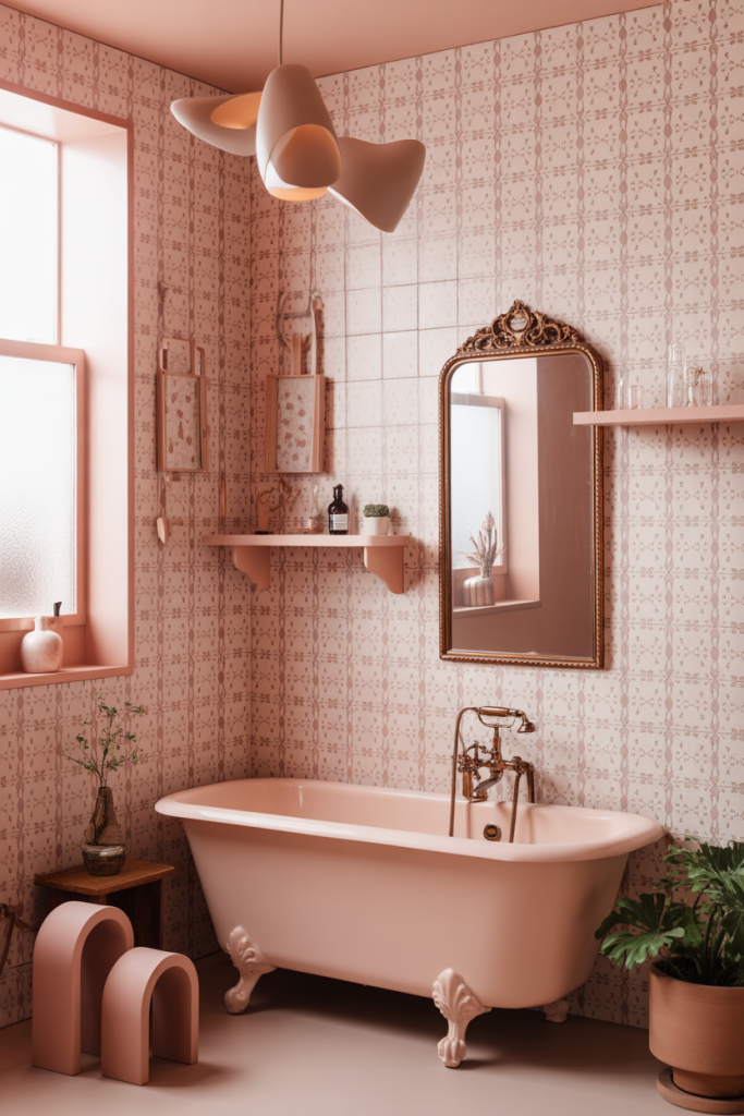 Patterned wallpaper in pink tones works well with Cute, Aesthetic, or Vintage influences. I’ve seen bathrooms where whimsical wallpaper brought the space to life, especially paired with simple fixtures. It’s a great strategy for people who want personality without committing to a full remodel. This works especially well in guest baths that benefit from visual storytelling.