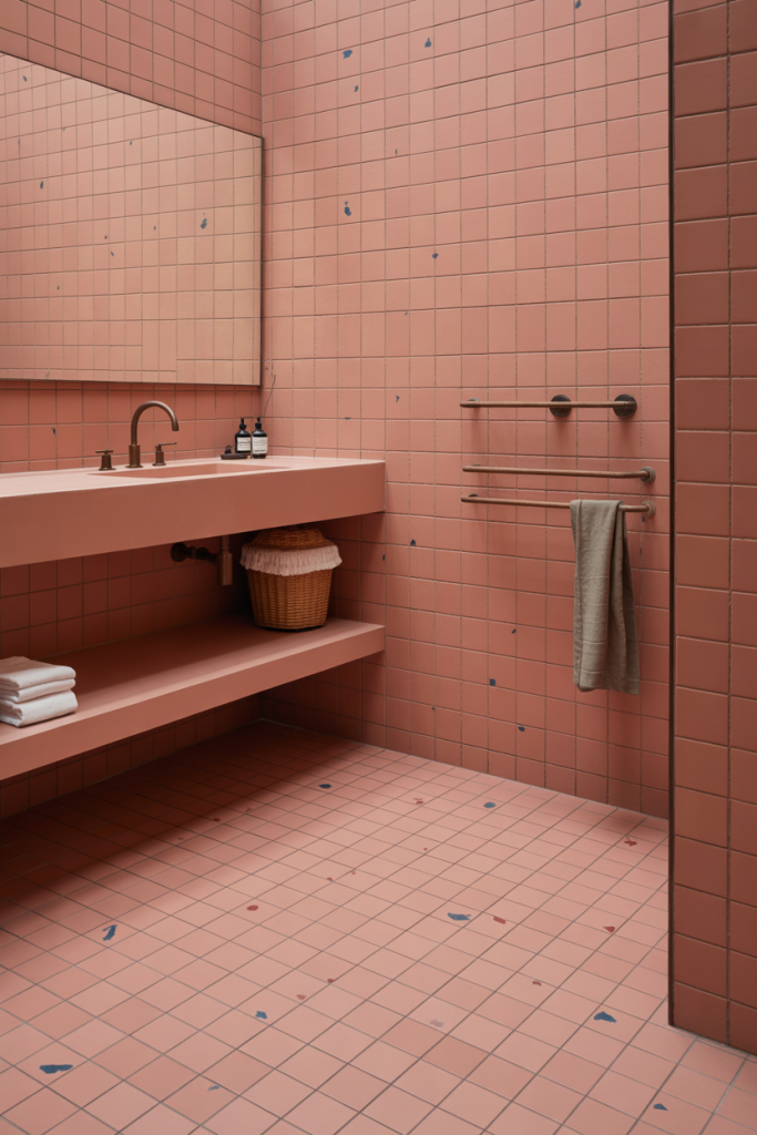Pink terrazzo flooring, flecked with hints of Blue and, Red and, or Black and, brings playful sophistication to any bathroom. A designer I follow said terrazzo adds “joy underfoot,” and in a pink version, it feels even more uplifting. It suits both contemporary homes and artistic spaces where texture, creativity, and durability matter. The effect is cheerful yet refined.