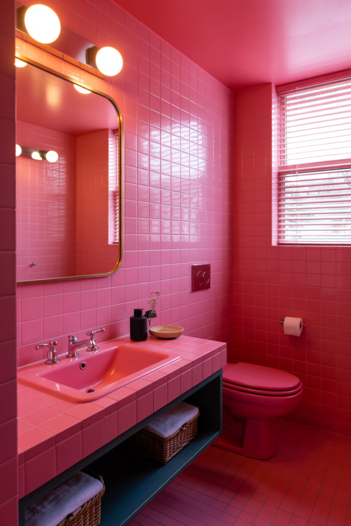 A playful yet chic way to energize a bathroom is adding Hot pink touches alongside Blush, Soft, or Dark elements. Think bold shower curtains, vibrant art, or a striking vanity color. A friend once joked that her hot-pink mirror frame worked better than coffee—one glance and she felt awake. This style is for those who embrace lively rooms that spark morning motivation.
