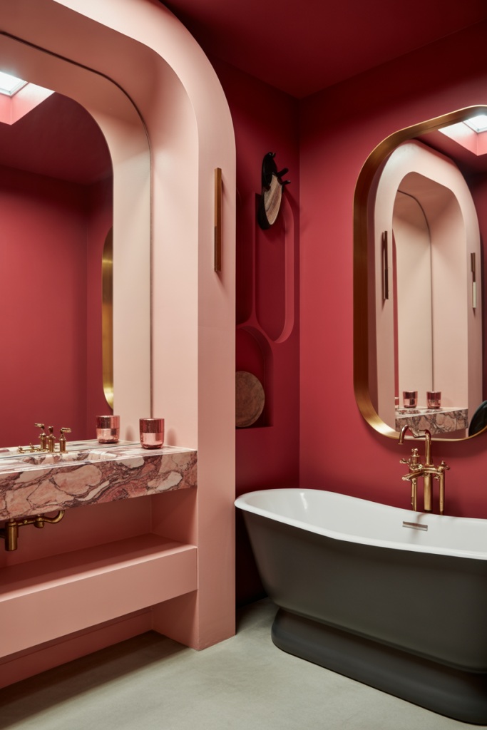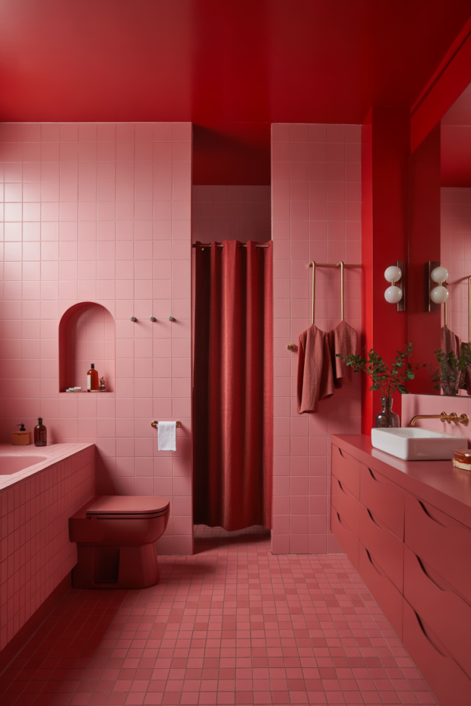 Blending pink with Red and dramatic tones creates a statement look reminiscent of boutique bars and bold editorial interiors. It’s daring but surprisingly cohesive when you work with deeper reds and muted pinks. I once saw this pairing in a small guest bathroom, and it immediately became the most complimented room in the house. Ideal for expressive personalities.