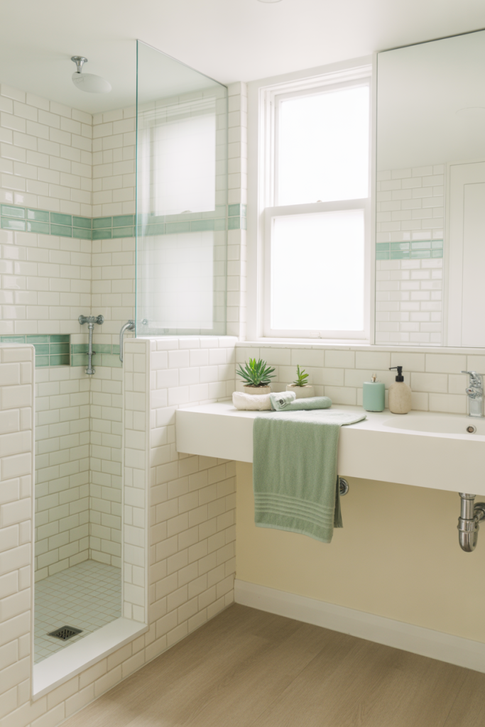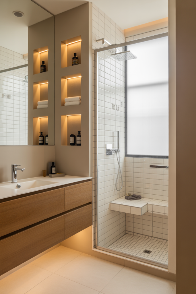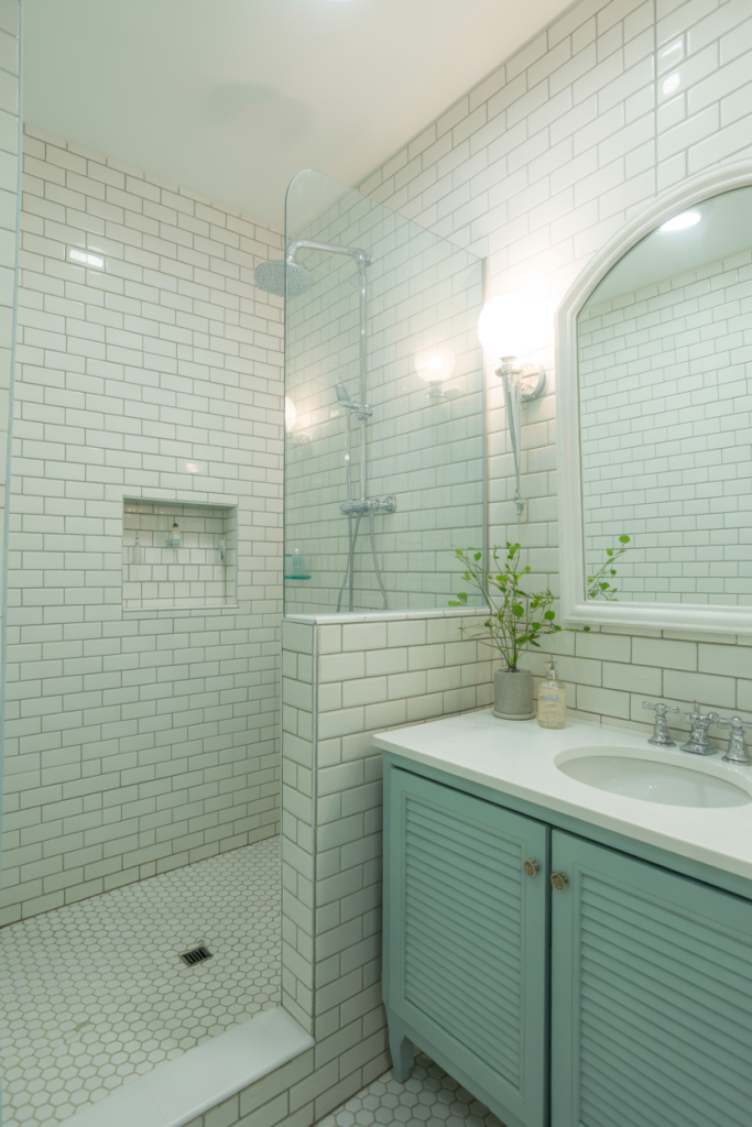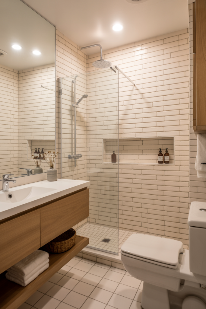 Small bathrooms benefit most from multiuse solutions—mirrored cabinets, floating vanities, and shelves above the washing machine. One of my favorite tricks is combining a shower walk with recessed niches that hold everything neatly. This style works well whether you prefer Bohemian, elegant, or industrial details and helps stretch the space without major renovation.