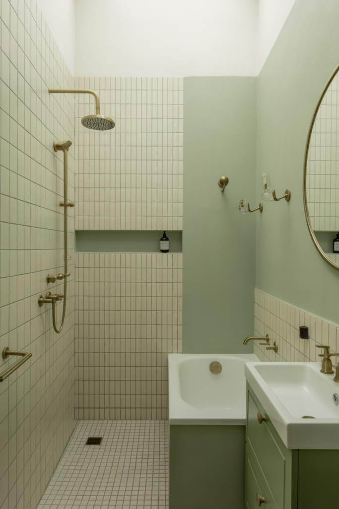 Green accents create a sense of serenity for a small bathroom, especially if combined with elegant details like simple brass fixtures and a slim shower configuration. One time, I rented a very small Airbnb where a green-colored wall helped to soften morning sunlight instantly—I felt like I was in a larger bathroom than it really was! This effective combination of pale wood and small tub tester designs brings a soothing spa experience to any bathroom, no matter its size!