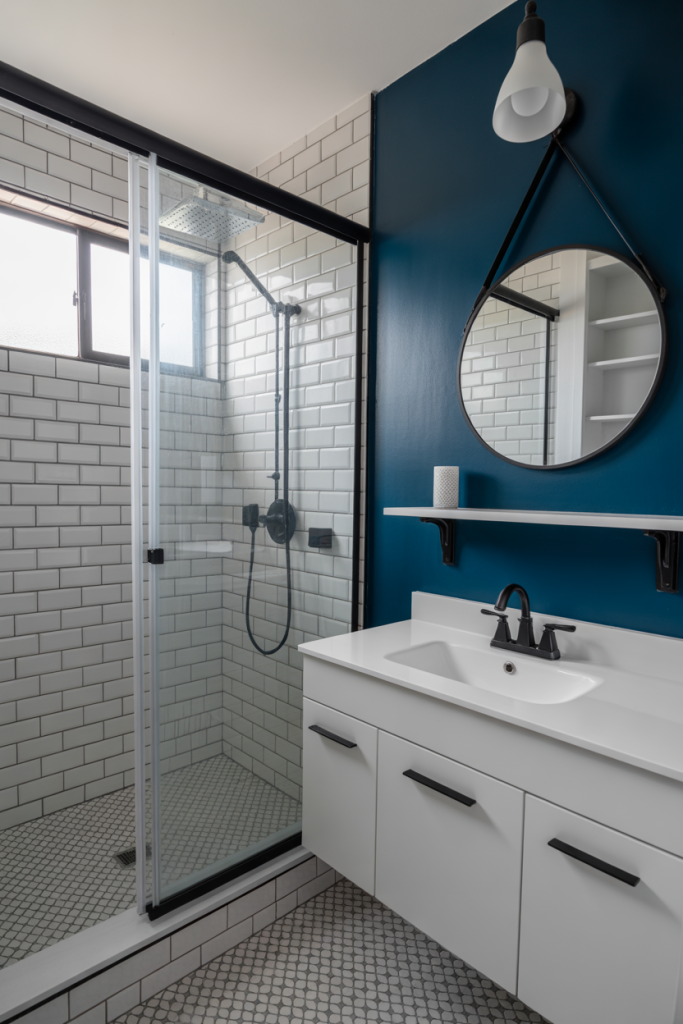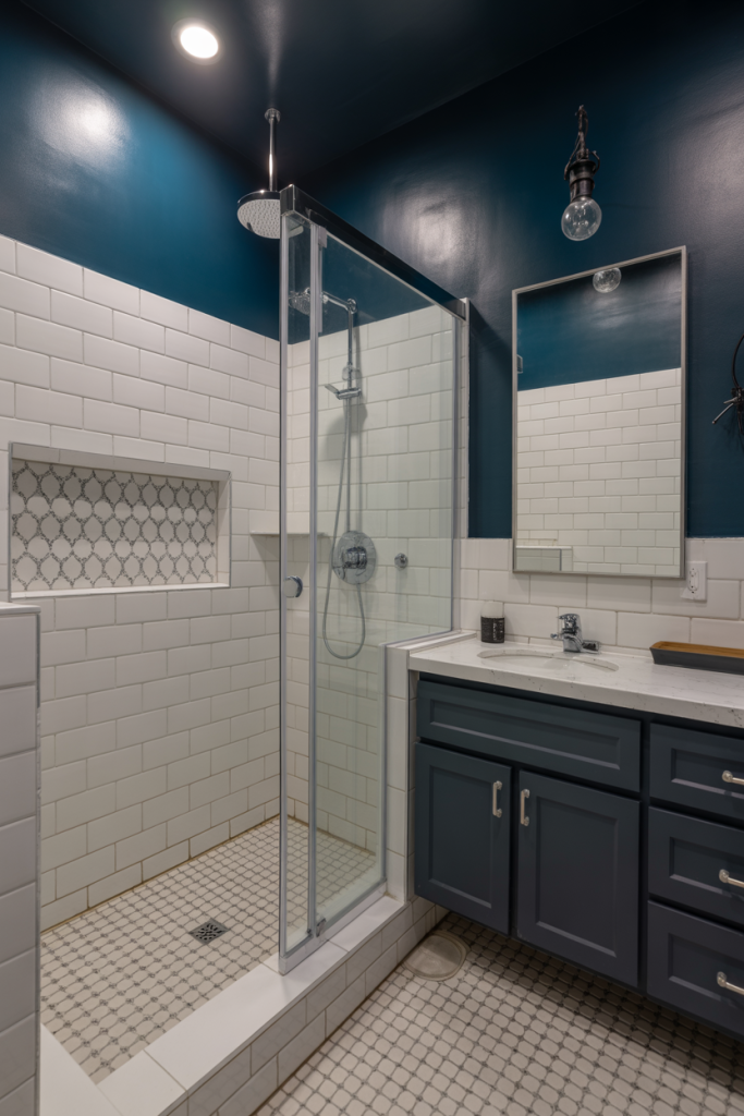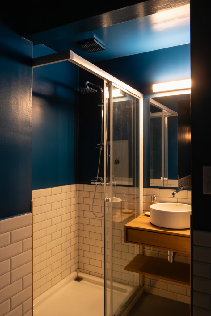 Deep dark navy can surprisingly calm a compact space, especially when balanced with soft lighting and natural textures. I once visited a tiny duplex where the owner painted only the upper half of the wall in rich blue, creating depth without overwhelming the room. Paired with a slim shower walk, a simple vanity, and a touch of muted grey, the look became both dramatic and soothing.