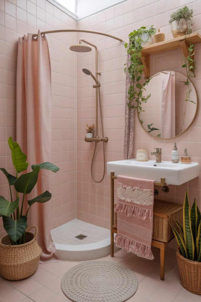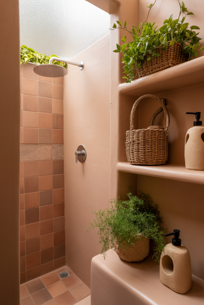 Soft clay-inspired tones with a hint of pink create an inviting, rustic atmosphere ideal for tight bathrooms. A friend mixed textured paint with handcrafted accessories, turning a cramped room into a cozy retreat. With a shower-only arrangement and a small niche for essentials, the space feels both lived-in and well curated. Touches of green plants bring balance and charm.
