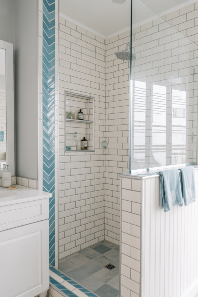 A modern coastal look thrives in small rooms, especially with pale grey flooring and soft blue tile. During a beach rental remodel, I watched a designer use vertical tile to draw the eye upward—a subtle but powerful trick. Add a shower niche and light wood elements for warmth. This airy palette makes even tight corners feel breezy and open.