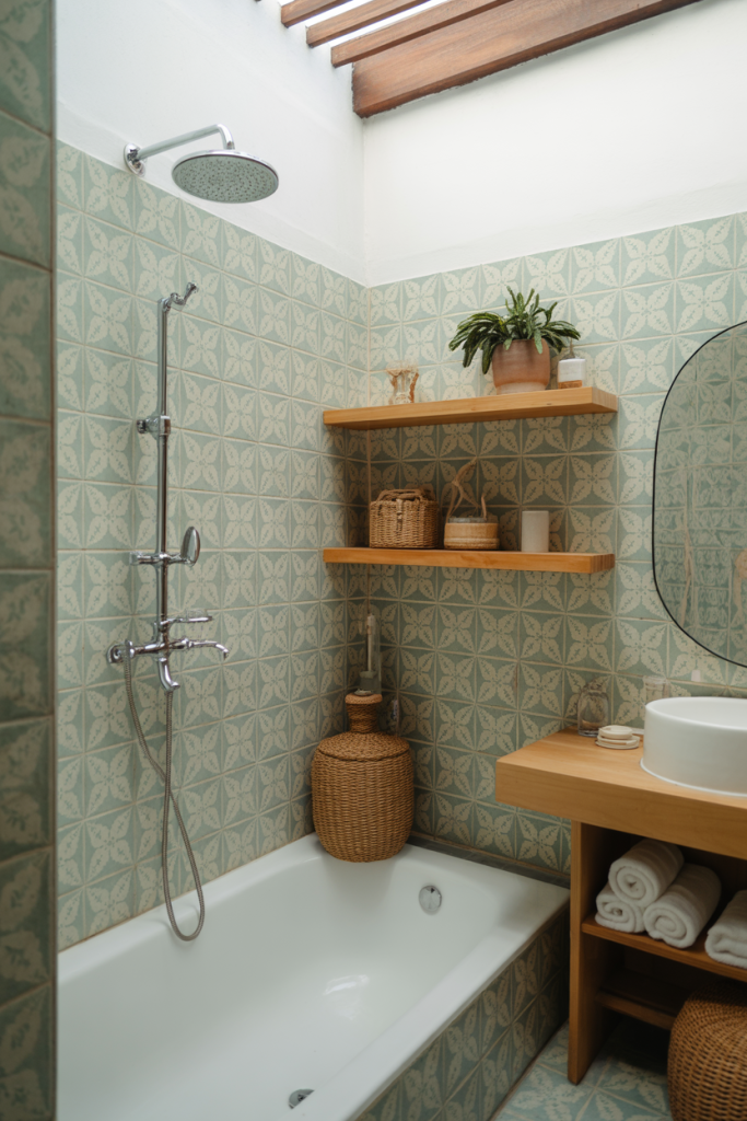 A patterned floor in soft green is a bold but doable Bohemian choice for tiny bathrooms. When I helped a friend redesign her studio bath, a patterned tile instantly became the star of the room. With floating shelves, a simple vanity, and a small tub trimmed in natural textures, even a micro-space gains charm and personality without visual clutter.