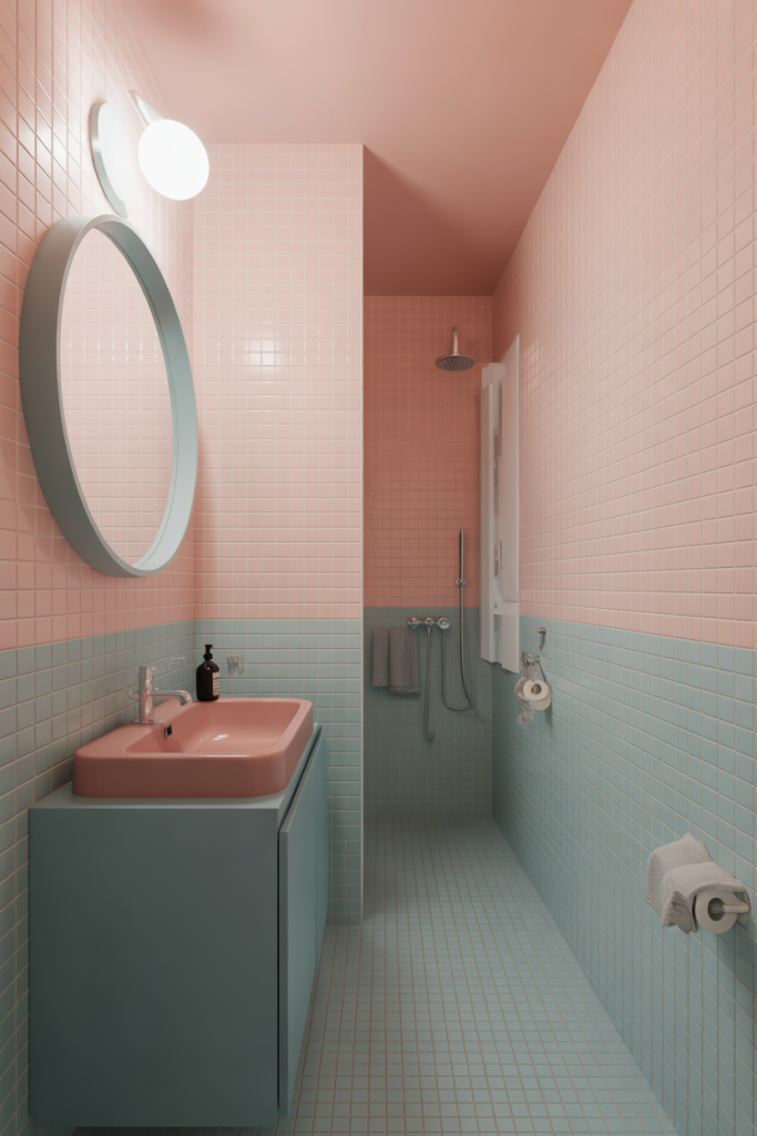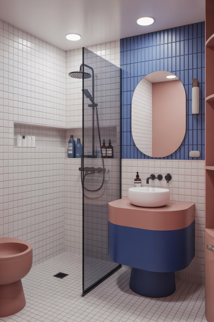 A lively mix of blue and pink captures the playful essence of Toca Boca styling. It’s especially fun for a kids’ bath or a youthful apartment. A bright rug, rounded mirror, and compact shower-only setup keep the energy high while staying functional. I’ve seen hallway bathrooms come alive with just a few bold pops of color and a cheerful arrangement.