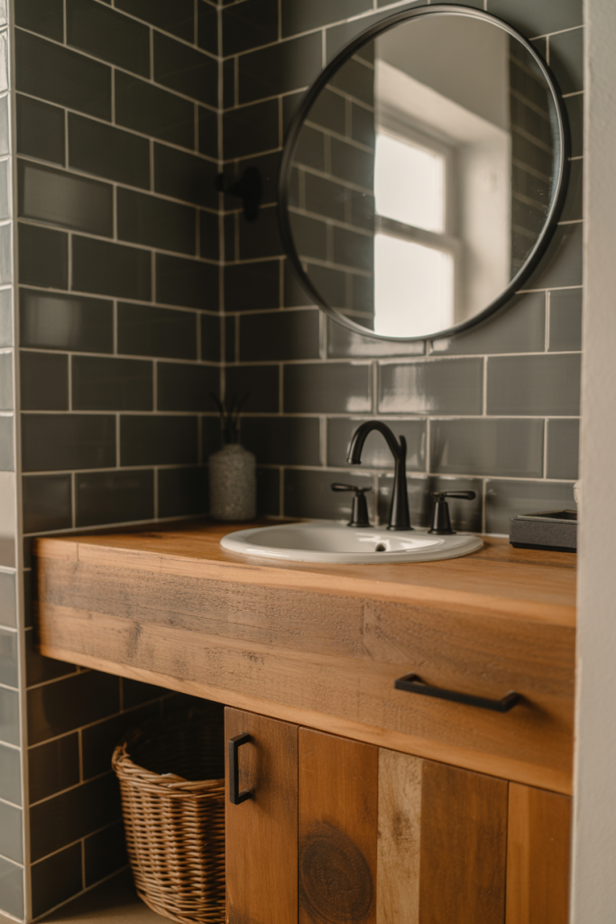 For my guest bathroom at home, installing wooden cabinets instantly gave my small bathroom its warm touches to match its dark colors and minimalist shower-only bathroom layout.