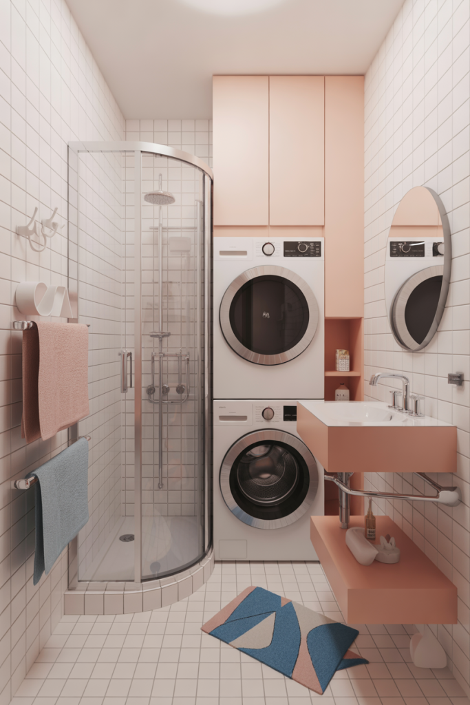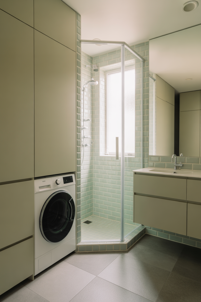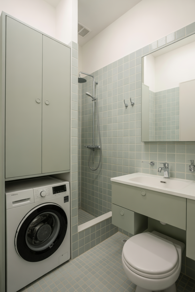 A cleverly built-in cabinet for a washing machine frees up precious floor space while maintaining a very clean look. I once toured a micro-studio where the machine was tucked behind a sliding door beside a shower enclosure—it was seamless and stylish. Combine hidden storage with pale grey or green finishes and a small bath or shower setup for maximum versatility.