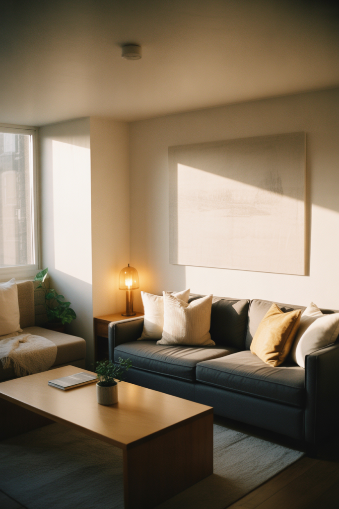 This style works best in apartments with open layouts where the living room flows into other spaces. Keeping colors restrained helps the home feel cohesive instead of visually broken up.
