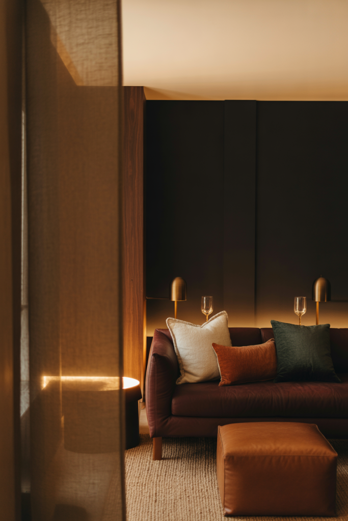Cozy doesn’t always mean light. Deep, enveloping tones can create a comforting cocoon for families who love evenings at home. A dark, moody living room layered with warm woods and soft fabrics feels intimate rather than heavy. This style pairs beautifully with an earthy palette and subtle lighting that highlights texture over brightness.