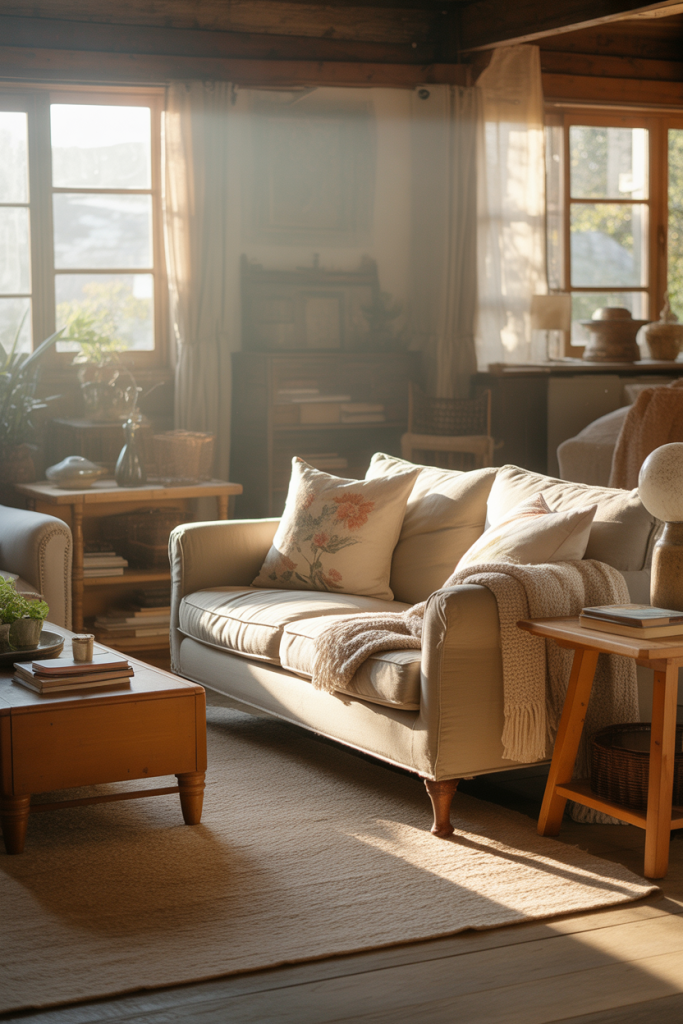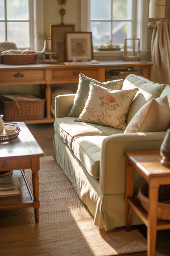 Cottage-inspired living rooms bring softness, nostalgia, and charm into everyday life. This look feels especially cottage-style and cute when mixed with eclectic details like mismatched pillows or vintage accents. The result is a cozy room that feels collected over time, not decorated all at once.