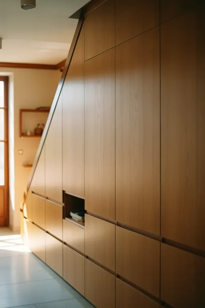 The space Under a staircase can become a streamlined storage solution instead of a clutter zone. Custom cabinetry fitted neatly Underneath works especially well in a compact Entry or Loft layout. With clean lines and concealed handles, the design feels intentional rather than improvised.