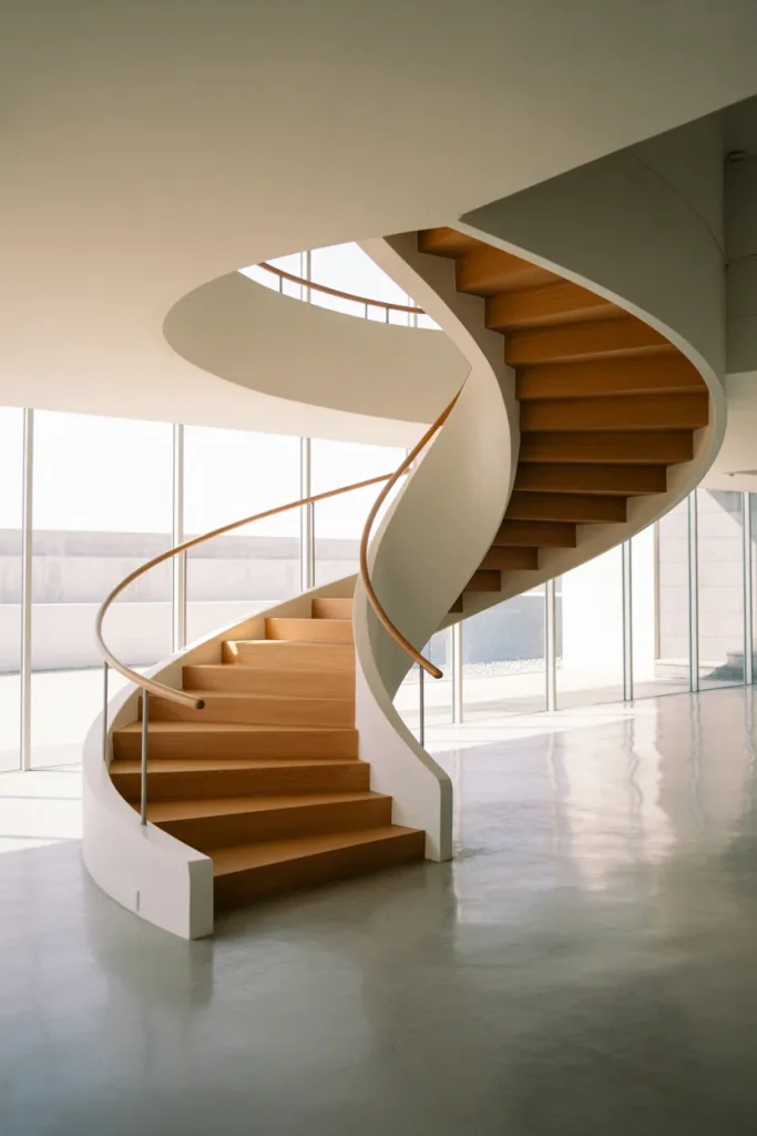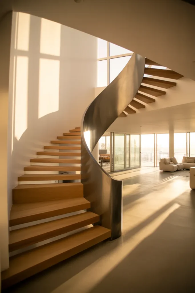 A common mistake is overcrowding the space with oversized furniture beneath the curve. Let the staircase breathe. When styled minimally, its lines become the focal point rather than competing with décor.