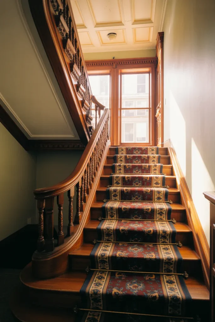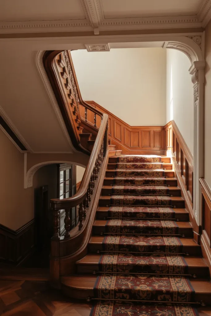 A grand Victorian staircase in the main Entry sets a dramatic tone. Detailed balusters, layered Decoration, and even subtle Carpeted runners emphasize craftsmanship. This approach works beautifully in restored historic homes that celebrate intricate woodwork.