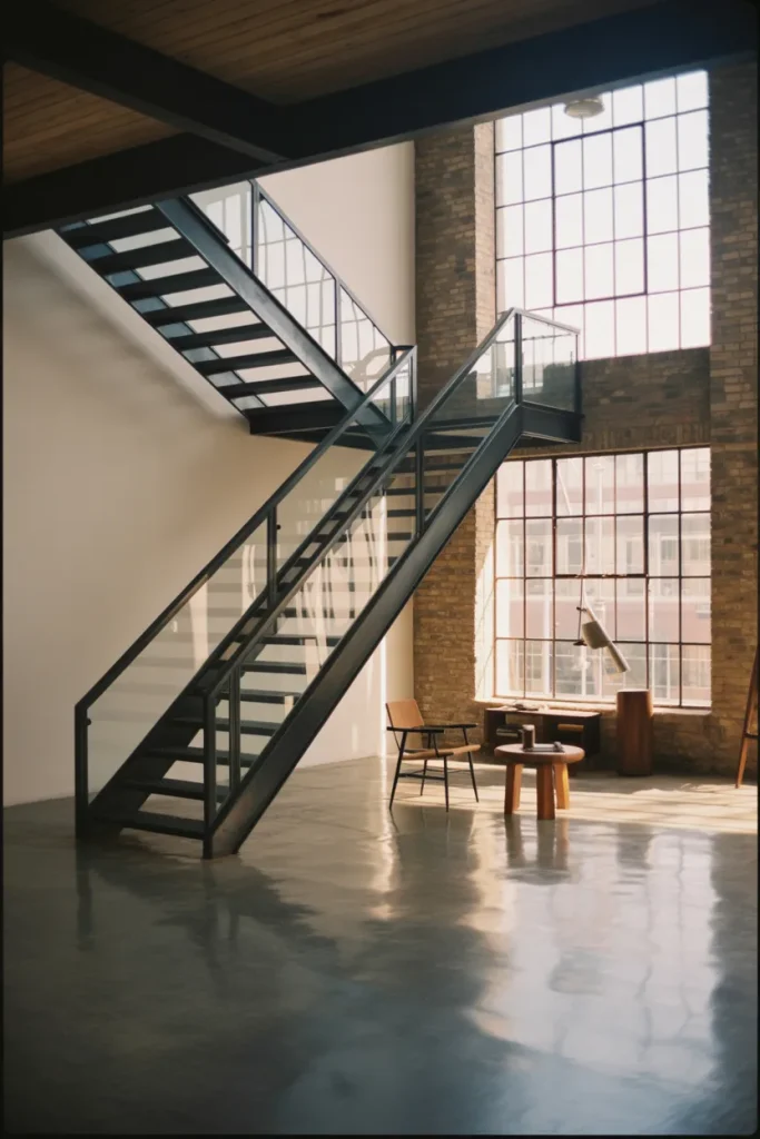 An Open staircase in a high-ceiling Loft highlights vertical space beautifully. Combining Glass panels with exposed steel creates a subtly Unique contrast between transparency and structure. This style embraces industrial character without overwhelming the room.