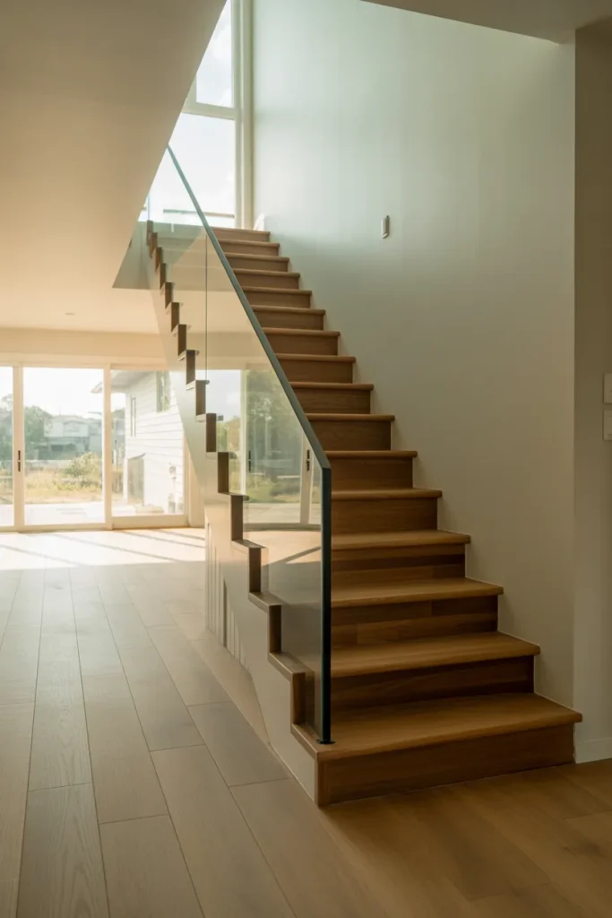 A staircase combining warm wood treads with sleek Glass panels feels fresh in an Open concept home. This Modern mix softens hard lines while keeping sightlines clear. In a central Entry, the transparency allows natural light to travel deeper into the space, making even suburban layouts feel expansive.