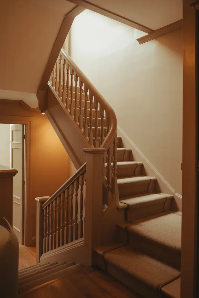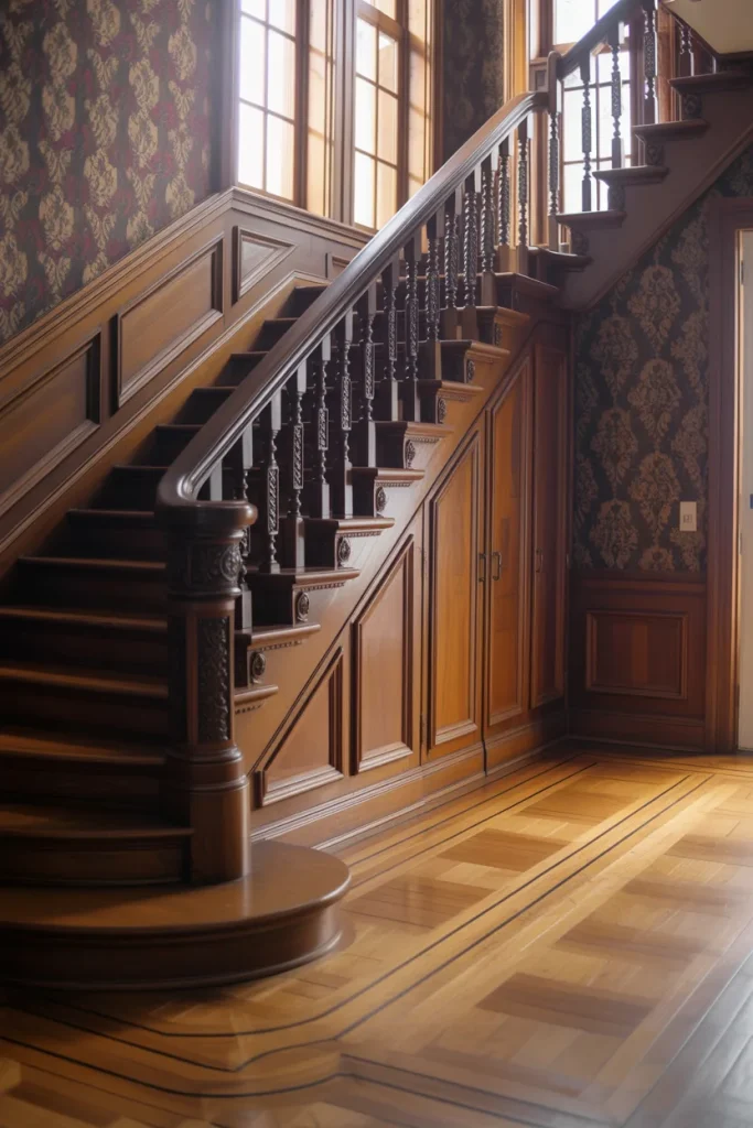 A classic Victorian stair can still be practical. Integrating storage Under or Underneath the steps adds functionality without compromising traditional details. Rich woodwork and subtle Decoration maintain the historic tone while solving everyday clutter.