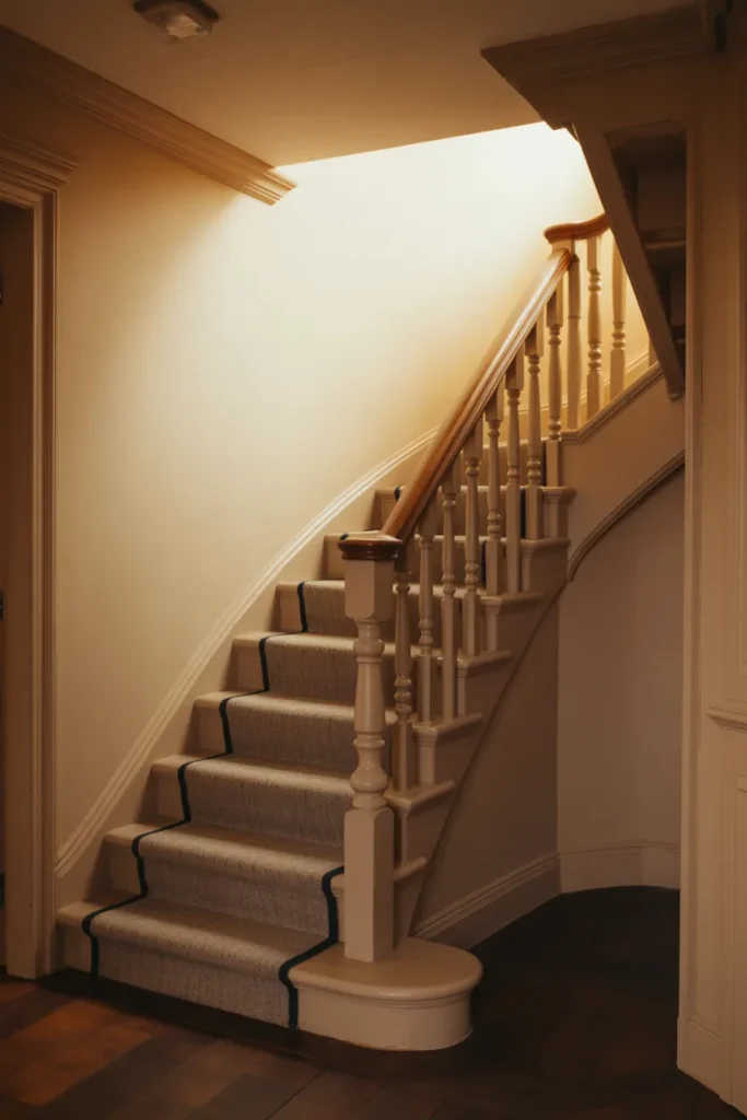 A gently Curved staircase in a Cottage home feels romantic and welcoming. Adding a lightly Carpeted runner softens each step while maintaining charm. Even in slightly Dark hallways, warm neutrals and subtle lighting keep the curve feeling cozy rather than dramatic.