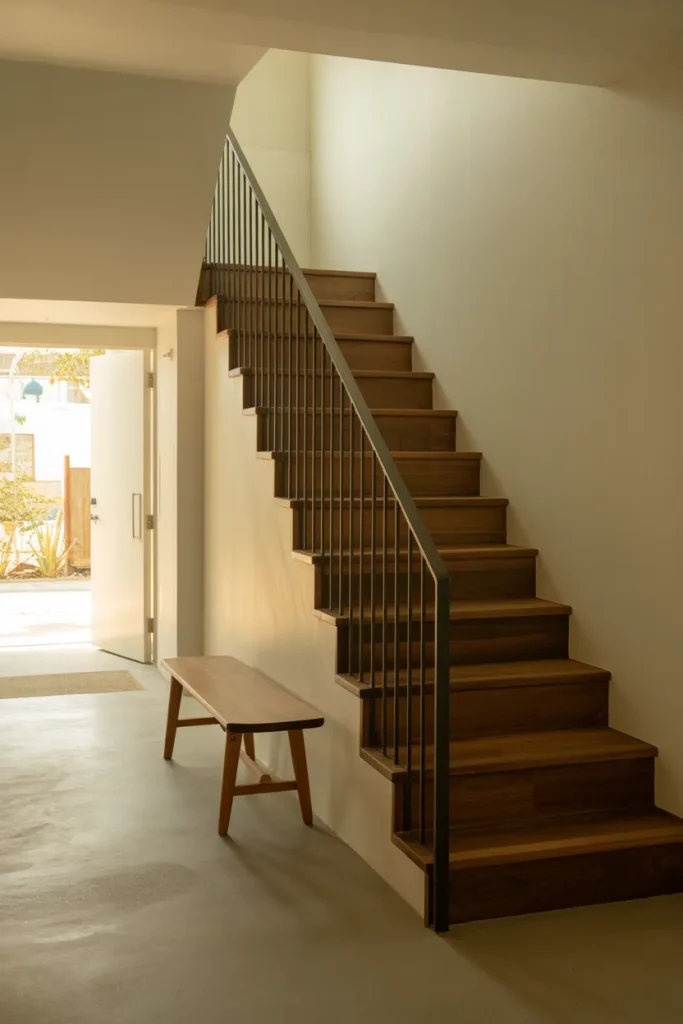 A bold Dark staircase can anchor a minimalist Entry beautifully. In a Modern home with partially Open sightlines, deep-toned treads paired with light walls create dramatic contrast without overwhelming the room.