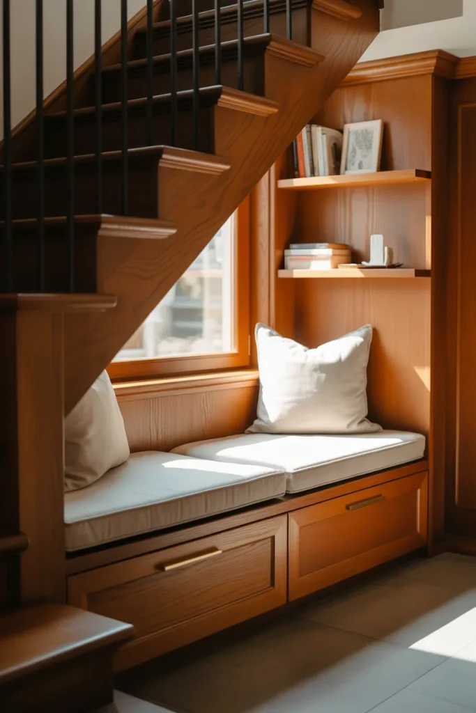 The space Under or Underneath a staircase is prime real estate in American homes. Instead of leaving it empty, create a cozy built-in bench or storage wall. This is especially smart in a Narrow Entry where every square foot counts and first impressions matter.
