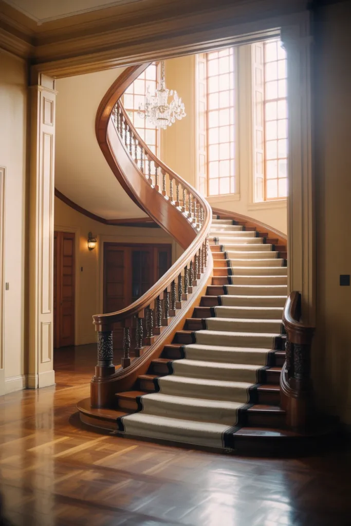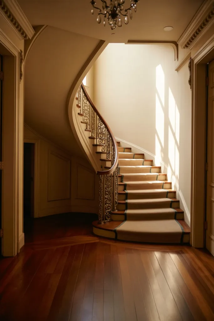 A dramatic Curved staircase inspired by Victorian architecture adds instant grandeur. Often Carpeted for comfort and sound control, these sweeping forms suit homes with tall ceilings and formal foyers. They feel romantic, detailed, and unapologetically expressive in a world leaning minimalist.