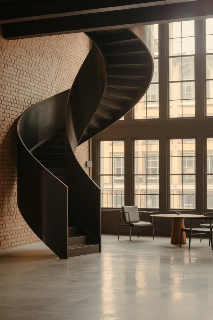 In a downtown Loft or compact apartment, a sleek Spiral stair saves space without sacrificing style. Many homeowners choose a matte Black finish for contrast against brick or concrete. This solution works particularly well in semi-Open industrial layouts where vertical movement becomes part of the visual rhythm.