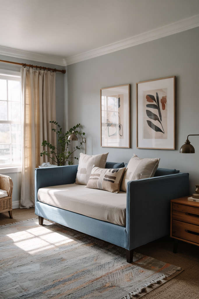 A gentle palette makes any guest room feel instantly inviting, especially when you play with soft tones like powder blue and subtle neutral accents. A slim-profile daybed keeps the layout flexible, while layered textures create a serene, relaxing atmosphere without overwhelming a small footprint.