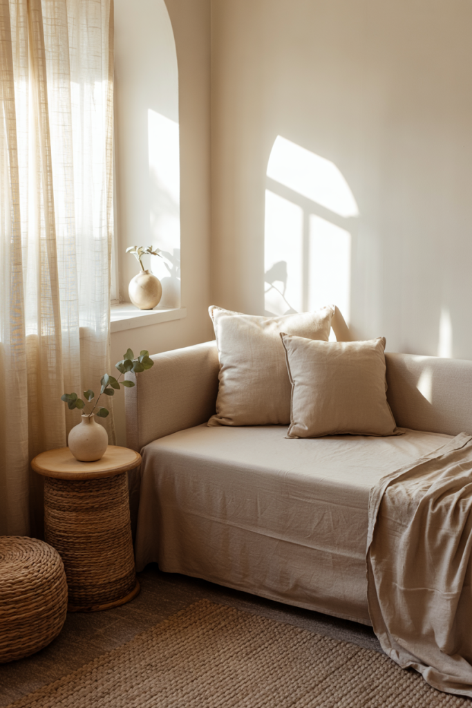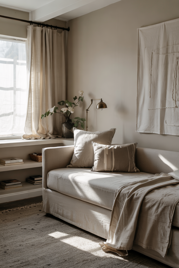 A calming palette built around muted green tones instantly creates a grounded atmosphere. Light wood furniture and a slim daybed help the space feel airy, while soft throws introduce a relaxing touch. A few cozy layers complete the feeling of an inviting, restorative corner.